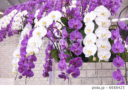 二色の胡蝶蘭(紫&白)のディスプレイ:世界らん展