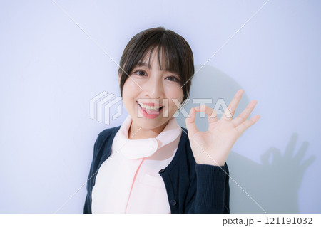 一般看護師のオッケーやイイネ!goodのポーズ 水色背景