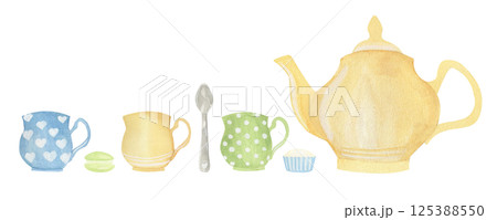 Whimsical watercolor of a tea set cups, spoon, teapot, macaron, and cupcake in soft pastel tones. Perfect for invitations, kitchen prints, or children book illustrations, packages, scrapbooking