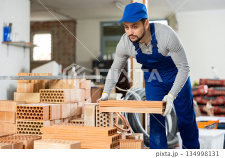 Owner of apartment checks verticality of wall, made by professional builder, using building level