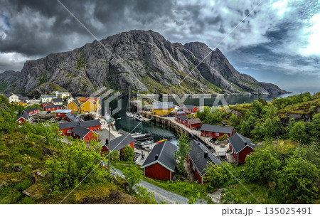 Old Fishermen Village Nusfjord With Rorbuer Huts And Calm Fjord On Lofoten Islands In Norway