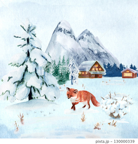 Fox on snowy field, pine tree with snow, cozy wooden cabins with glowing windows, mountain forest. Hand-painted watercolor winter scene great for Christmas cards, seasonal posters, winter landscapes