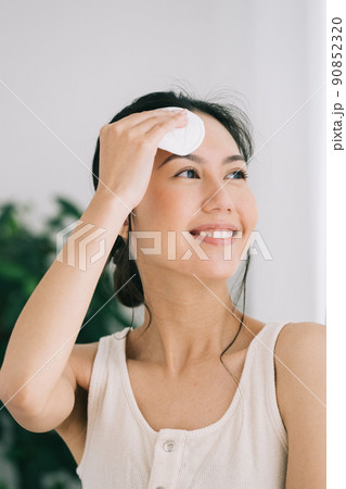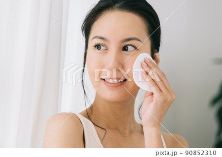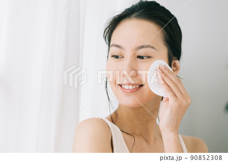 保湿・スキンケア・化粧水、天然素材のコットンパフを使う女性