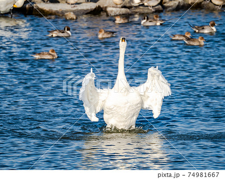 羽根を広げるコハクチョウと琵琶湖を泳ぐ水鳥たち