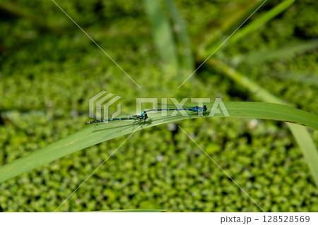 Two Blue Damselflies Perched on a Green Blade over Duckweed Pond