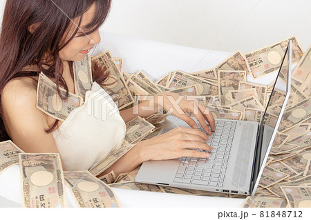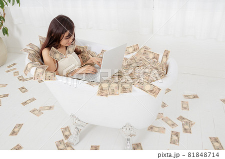 札束風呂でパソコンで売買を繰り返す女トレーダー及び売れっ子ライターイメージ