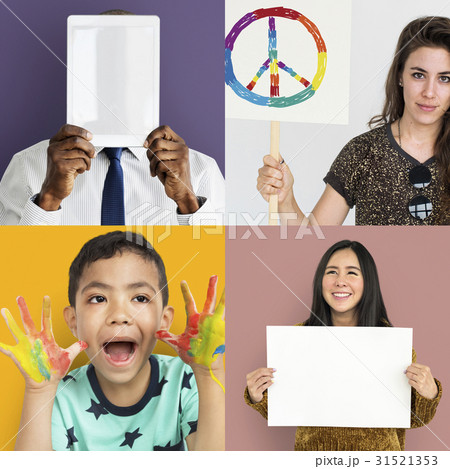 Diverse People Hold Blank Paper Board Copy Space Collage