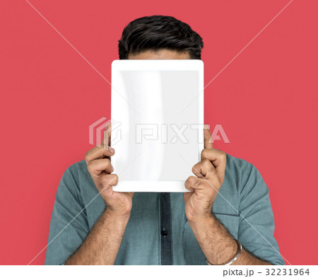 Man Hold Blank Digital Tablet Copy Space