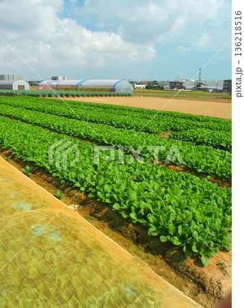 シートの掛けられた秋の郊外の小松菜畑風景