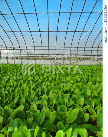 温室栽培の秋の小松菜畑風景