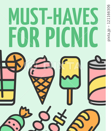 Must-Haves for Picnic Summer Party Concept Vertical Invitation Placard Poster Banner Card Template. Vector