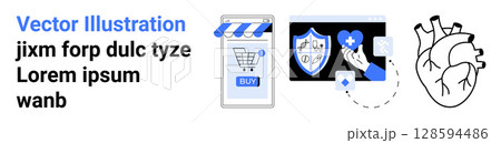Shopping cart with a striped awning and BUY button, shield with a heart and hand, human heart sketch. Ideal for e-commerce, cybersecurity, healthcare, medical, anatomy education, wellness