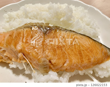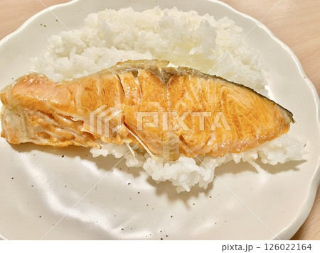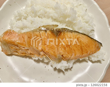 写真素材: 白い皿にのった焼き鮭と炊きたてごはん
