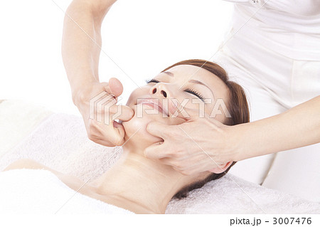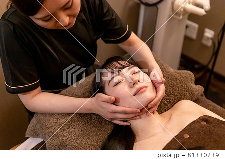 エステサロンでリンパマッサージ・小顔矯正・コルギをするセラピスト・エステティシャン・カイロプラと女性