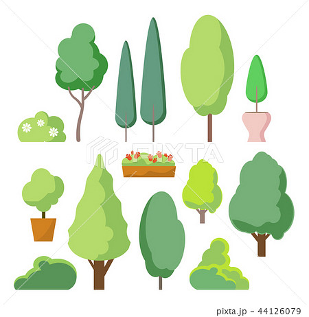 Cartoon bush and tree set. Vector trees and bushes isolated on white background, nature green forest