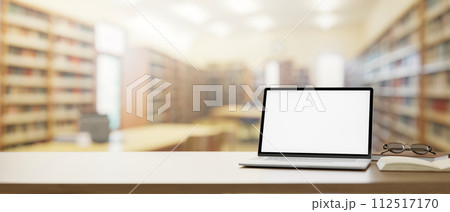 A wooden table features a laptop computer mockup over a blurred background of a school library.
