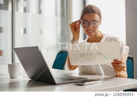 A Professional Businesswoman Wearing Glasses in a Contemporary Office Setting with a Laptop