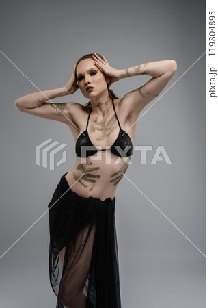 Contemporary topless ballerina posing in studio
