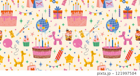 Birthday Seamless pattern with Festive decor like celebration cake with candles, balloons, sweets, gifts, garland and stars. Trendy modern vector illustration on light background, hand drawn, flat
