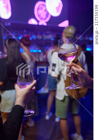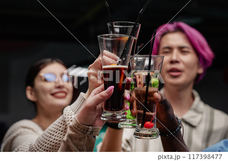 Cheering, drinking cocktails. Group of friends partying in nightclub and toasting drinks cocktails.