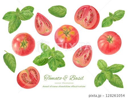 水彩手書きのフレッシュなトマトとスイートバジルのカットイラスト素材