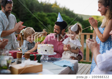 Multi-generation family on outdoor summer garden party, celebrating birthday