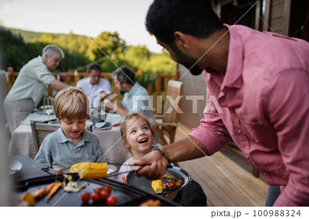 Multi generation family having bbq party outside in the backyard on patio.