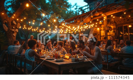 AI-generated content. Families and friends gathered outside their home for an outdoor summer dinner on a warm summer evening. Multiethnic people having fun, communicating with each other, and eating.