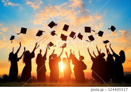 Students throw their graduation hats in the air to celebrate graduation, confetti flying in the air