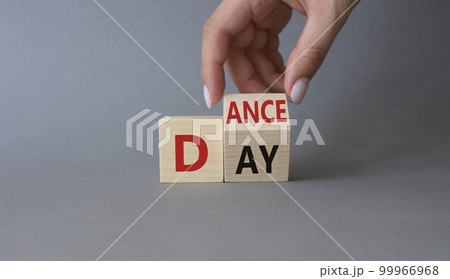 International Dance Day symbol. Businessman hand turns wooden cubes with words Dance day. Beautiful grey background. International Dance Day concept. Copy space.