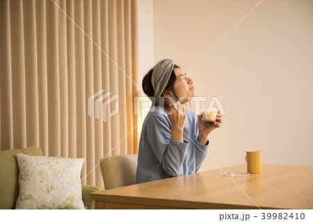 コンビニスイーツを食べている女性 美味しそうにスイーツを食べている人々