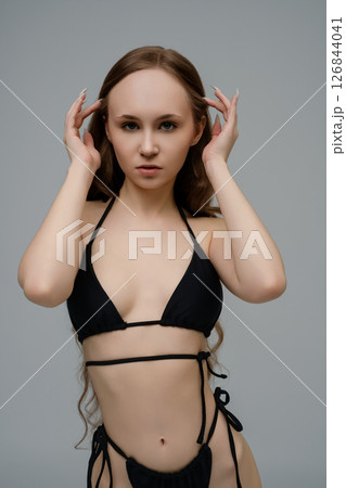 Woman poses confidently for modeling casting in minimal swimwear setting