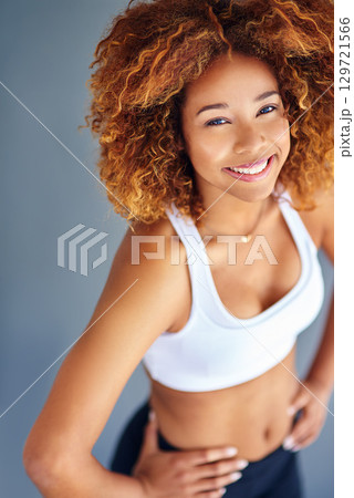 Black woman, fitness and exercise portrait, sport and athlete happy with body training and active lifestyle. Health, wellness and motivation for healthy living and workout with smile and pose.
