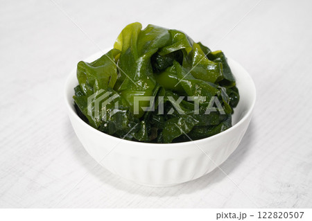Laminaria (Kelp) Seaweed in black ceremic bowl. Japanese healthy food.