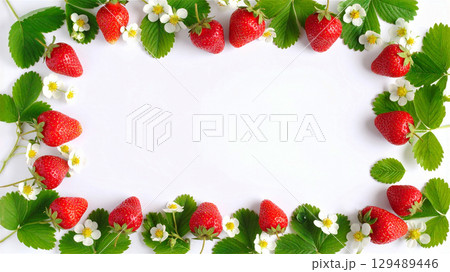 白い空間に浮遊している新鮮ないちご、お花、葉