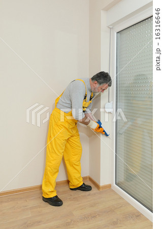 Construction worker using silicone sealant caulk for repair leaked inside window frame.