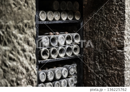 Vintage bottles stored carefully, Ancient wine containers in quiet chamber, Marbled chamber filled with aged wine bottles and cobwebs