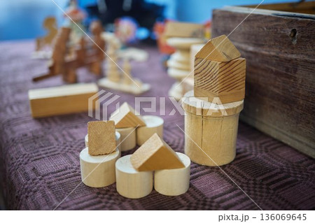 Rustic cork and timber showcase, Vintage handcrafted cork and wooden block arrangement, Artisan crafted cork and wooden scene with vintage box and handcrafted toy elements