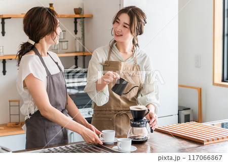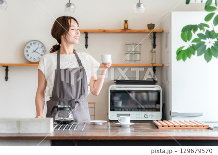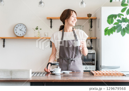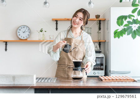 キッチン・カフェでコーヒーをいれる女性(コーヒーソムリエ,バリスタ,コーヒーインストラクター)