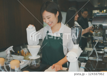 カフェ・コーヒーショップ・喫茶店でコーヒーを淹れるバリスタ・焙煎士の女性スタッフ・マスター