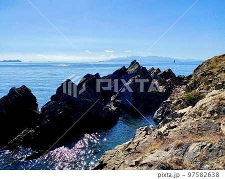 赤穂コールドロンを体感できる赤穂御崎海岸遊歩道からみた岩礁と瀬戸内海 兵庫県赤穂市