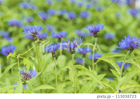 Blue cornflowers blooming in a summer garden, close up, selective focus