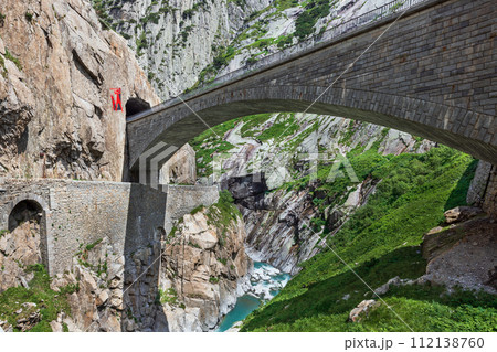 Red train passing by Devil's bridge at St. Gotthard pass on the Swiss Alps in Andermatt, Switzerland