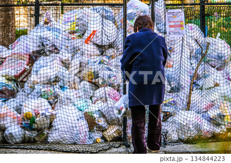日本の横浜都市景観山積み…街角のゴミ置き場。今年最初のプラごみ収集日。背丈をこえる山が…=7日、横浜