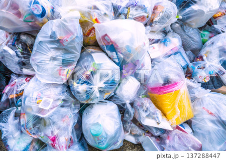 日本の横浜都市景観プラごみ…山積み…街角のゴミ置き場。プラスチック製容器包装収集日=3月4日、横浜