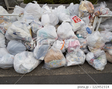 日本の横浜都市景観 パンや紙などが混在し収集されなかったプラスチック製容器包装の収集日に出された袋…