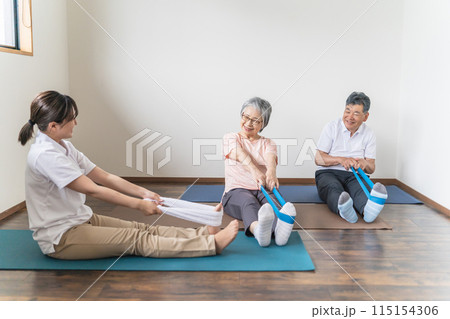 介護イメージ 体操するシニア女性と理学療法士撮影協力「LINK FOREST」
