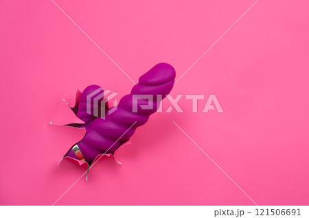 Raspberry sex toy sticks out of pink paper background. Copy space.
