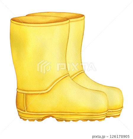 Pair of rubber yellow boots. Watercolor hand drawn illustration of autumn footwear. Boots isolated on white background. Template for creative autumn design. PNG