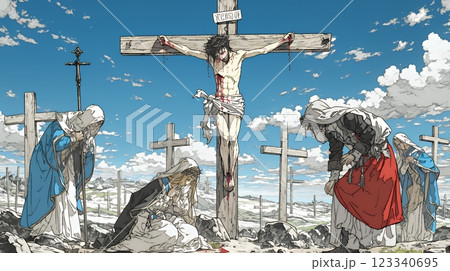 ゴルゴダの丘でキリストが十字架にかけられる風景